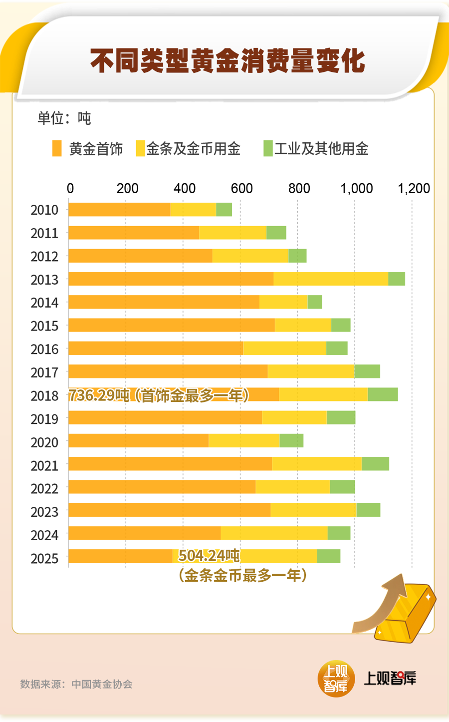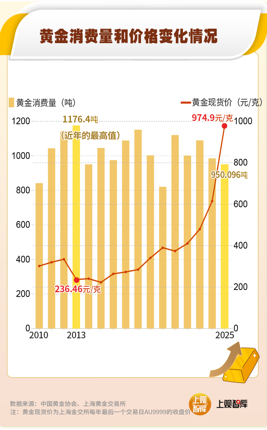 在金价狂飙60%的背景下,2025年国内黄金消费量虽然仍在950吨以上,但同比下降了3.57%。这已经是黄金消费量的三年连降。不知不觉,相比2013年的黄金消费最高值,已经少了200多吨,下滑了近20%。2013年恰恰也是金价的最低点,当时的金价经历了长达十余年的牛市后快速下跌,国内发生相对集中、大规模购买黄金产品的现象,甚至创造了“中国大妈抄底抢金,战胜华尔街”的轶闻。 之后,伴随金价整体平稳拉升,总体的消费量还是持续上升的。但随着金价高企,量价逐渐“脱钩”,或者说,“买涨不买跌”的朴素投资思维在转变,现在消费者的购金心态已然不同。而这一点,就要说到下一张图了。